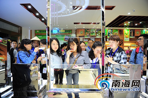 11月25日,“改革開放看海南”2018年全國融媒體海南行采訪團在興隆熱帶植物園挑選植物香水。南海網記者沙曉峰攝
