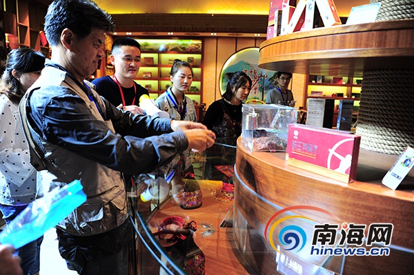 走進(jìn)展示區(qū),“琥珀湯奶蜜香”的水滿紅茶正在講述一代代茶農(nóng)的勞作與收獲,富有民族特色的黎錦苗繡正在展示那絢麗多彩的民族記憶,土蜂蜜、百香果、山蘭米、憂遁草等一百多款五指山特色農(nóng)產(chǎn)品有序排列,吸引了采訪團(tuán)成員或駐足觀看,或拍照留念。
