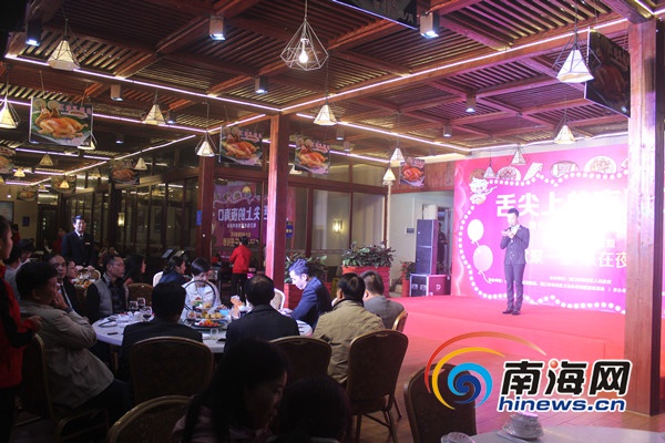 活動現場,歡樂海岸美食聯盟常務副總經理楊東華為現場觀眾推介歡樂海夜市。歡樂海岸美食聯盟是由海南新寶島餐飲管理有限公司傾力打造的,集特色餐飲、海洋產品深加工、原生態種養食材基地、漁業合作發展等多產業全新模式的連鎖品牌企業,于2015年9月26日開業,樓高6層,總建筑面積約35000平方米,設有海南家宴、潮汕家宴、海天一色、老廣州茶點、潮牛火鍋和宵夜大排檔等6大門店,各門店菜品風味各異,特色明顯。