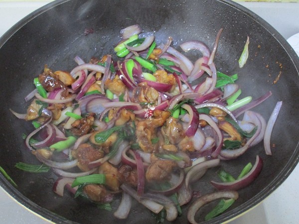 雞肉是腌制過的,在炒洋蔥和大蒜的時候加入少許鹽,主要把洋蔥和大蒜有個底味就可以了。各家的口味不同,不吃辣的可以不加辣醬面,可以依照自家的口味調整味道。