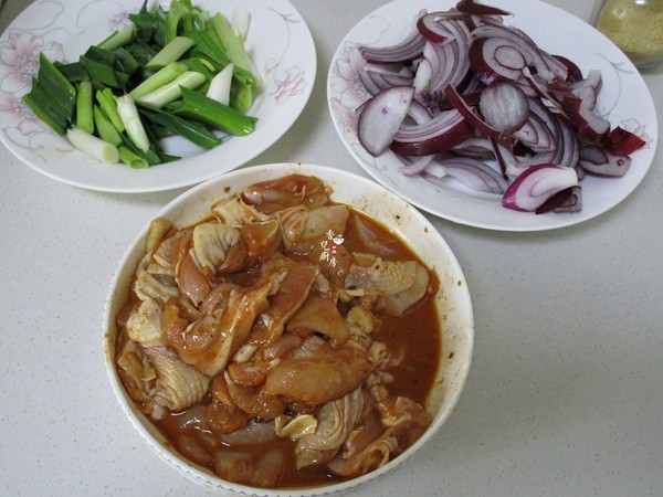 3.切好的雞塊里加入1茶匙鹽,2湯匙生抽醬油,1湯匙生粉和2湯匙黃酒,辣醬面一起用手抓勻后腌1小時以上,腌制的時間久一點肉質會更鮮嫩,而且還入味。洋蔥去除老皮后洗凈切絲,大蒜切成段