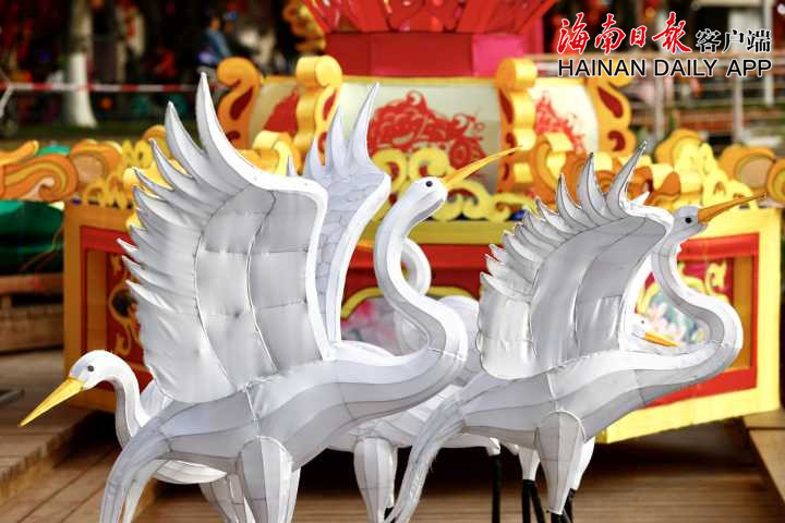 12月26日,記者在海口三角池公園看到,各色精美花燈在東湖畔有序擺放,工人在做造型拼接和通電施工。海南日報客戶端記者陳若龍 攝