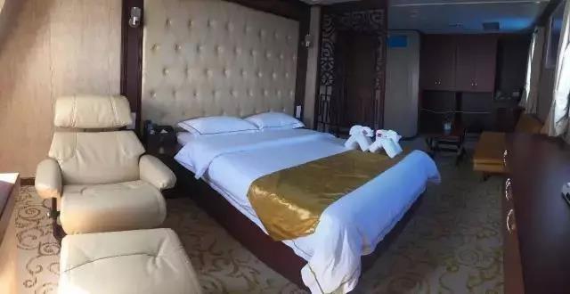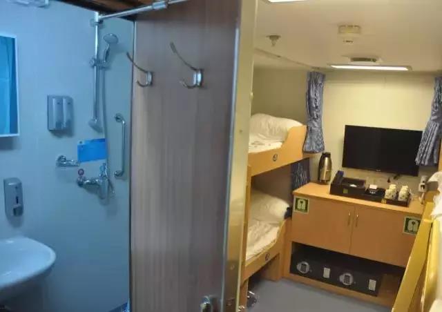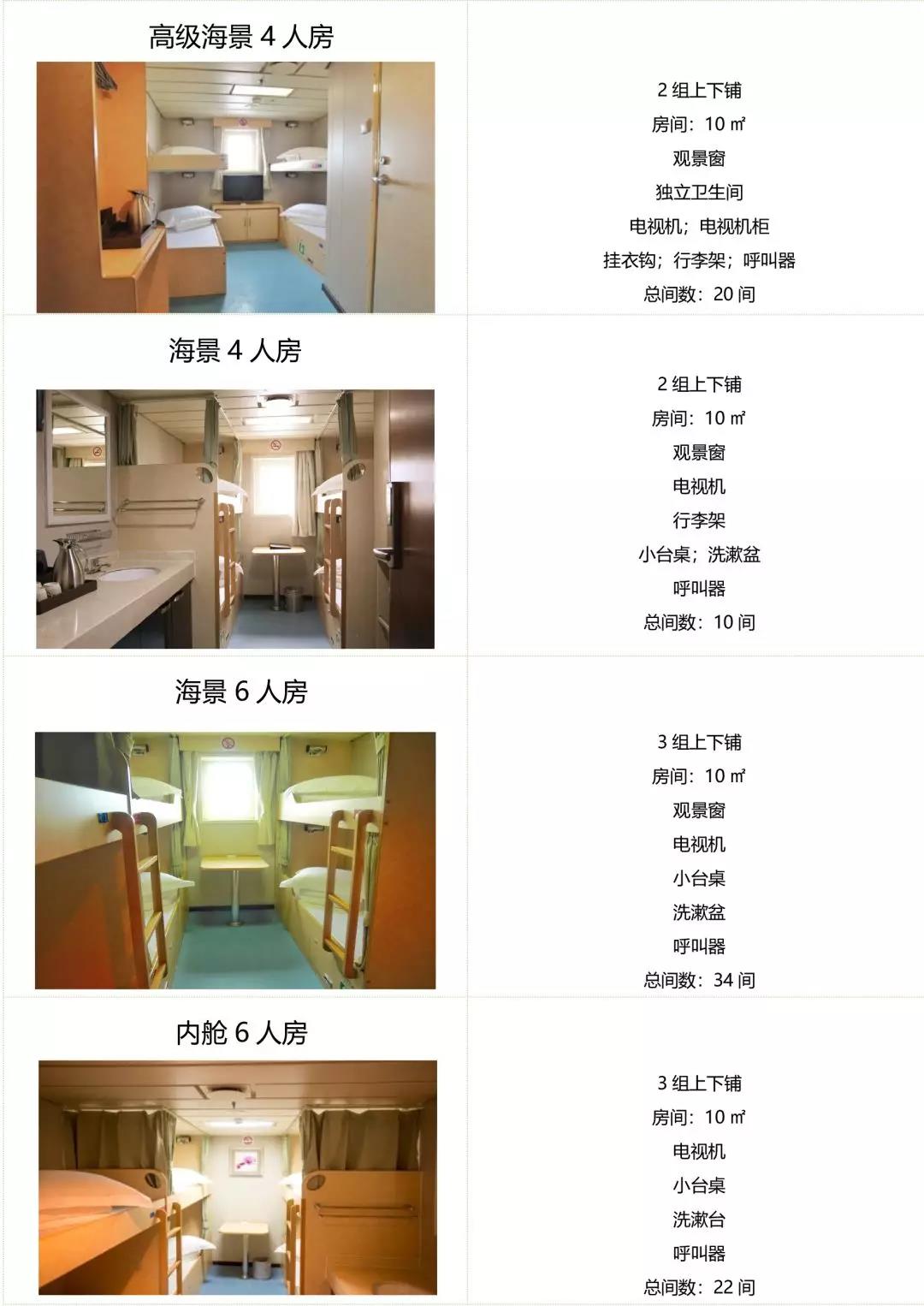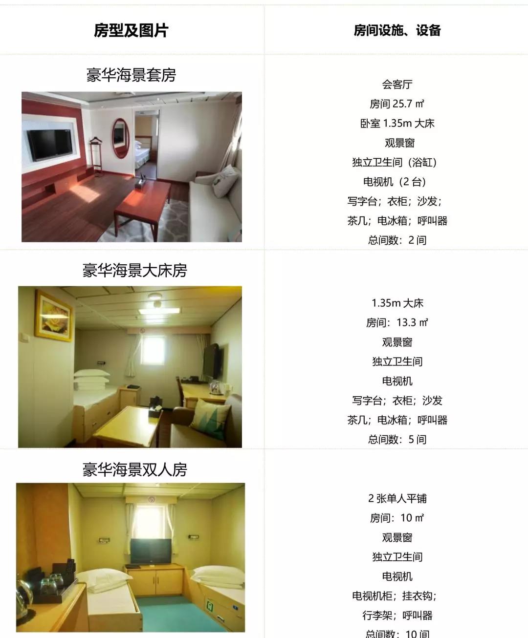 ▲ 房間設(shè)施:海景窗 | 獨(dú)衛(wèi) | 洗漱盆 | 電冰箱 | 電視機(jī) | 寫字臺(tái) | 衣柜 | 沙發(fā) | 茶幾 | 行李架(備注:可住2人,如住第三人按最低艙位價(jià)格收取)