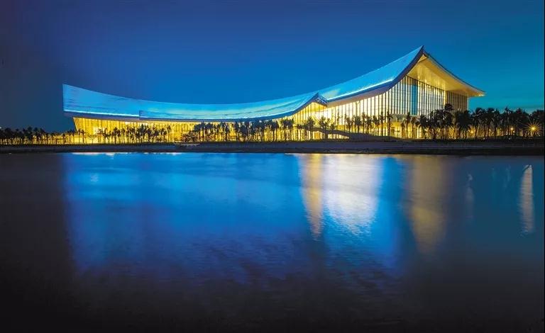 ↑夜色下的中國(海南)南海博物館。宋國強 攝
