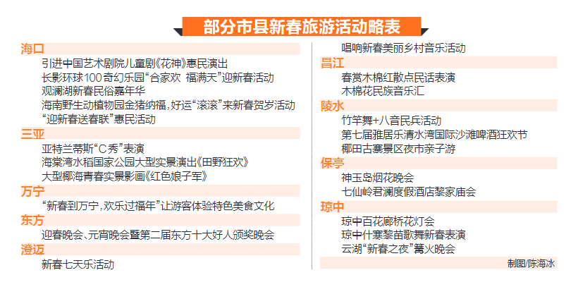 海南日?qǐng)?bào)???月31日訊(記者 趙優(yōu))春節(jié)進(jìn)入倒計(jì)時(shí),眾多消費(fèi)者即將開(kāi)啟新春旅游模式。海南日?qǐng)?bào)記者從省旅游協(xié)會(huì)發(fā)布的2019年“海南春節(jié)黃金周旅游市場(chǎng)信息”獲悉,春節(jié)期間,全省旅游系統(tǒng)以全域旅游理念為指導(dǎo),以?xún)?yōu)質(zhì)旅游為目標(biāo),著力豐富旅游產(chǎn)品供給,推出眾多旅游新業(yè)態(tài),讓全民共享旅游發(fā)展成果、為春節(jié)增添更加歡樂(lè)的氛圍。