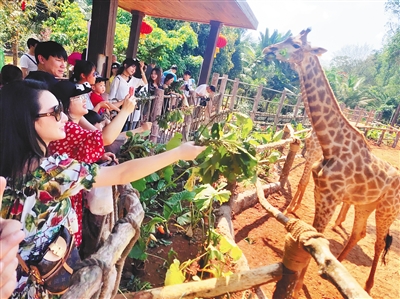 ?、?2月19日,游客在海南熱帶野生動植物園開心游玩。本報記者 張茂 攝