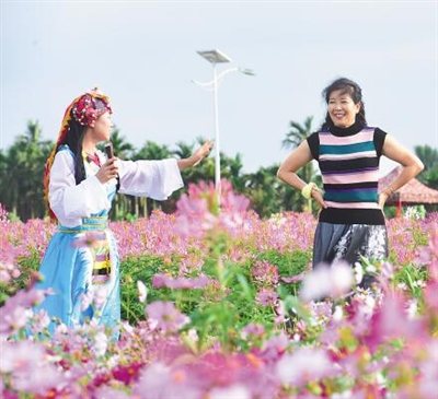 “一步一景,一步一花,好看極了。”連日來,眾多游客漫步在瓊海市嘉積鎮(zhèn)龍壽洋萬畝田野公園,這里地毯式、階梯式種植與節(jié)點造景、空間立體化布展相結合,構建出一片“流動”的花海,其中最多的當屬五彩繽紛格桑花。當游客舉目四望,紅、粉、白、紫等各色格桑花點綴在綠草之上,令人心曠神怡。