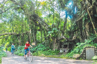 定安嶺口皇坡村,孩童在樹下騎行嬉戲。 本報記者 鄧鈺 通訊員 王聘釗 攝