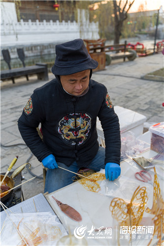 “來臺兒莊過大年,游客不僅能欣賞‘非遺’演出,還能參與其中,親自體驗中國傳統文化的魅力。”臺兒莊古城工作人員表示。木板年畫、扎染、活字……這些古老的技藝在臺兒莊古城被“活化”,景區不僅有成品展示,游客還可動手制作,留作紀念。“把傳統的文化、技藝用現代化的技術展現出來,更加直觀、生動,縮短了年代帶來的陌生感,也有利于傳統文化的傳播和傳承”。