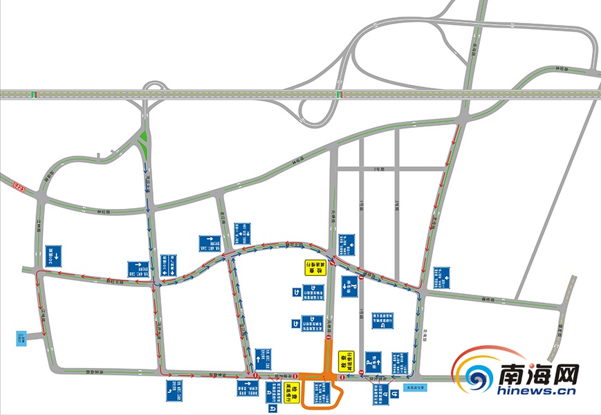 2019年度第五賽季國際汽聯電動方程式錦標賽三亞分站賽活動期間,由于海棠北路作為比賽賽道管制,造成海棠北路由北向南方向道路中斷,交警部門根據道路路網實際,實行以下引導通行措施: