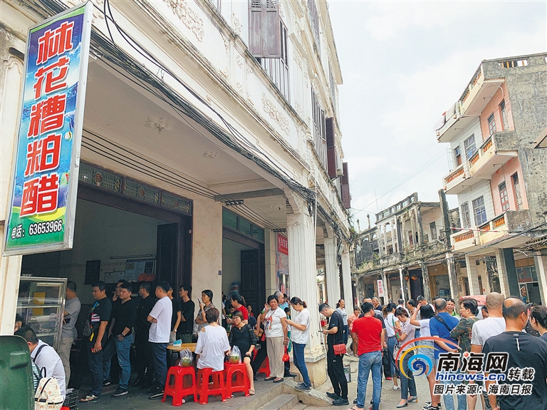 3月18日下午海文大橋通車后,由于海口方向的人流大量涌來,從當天下午開始,在鋪前吃糟粕醋便要排隊。3月19日14時,邢蓉妹身后的林花糟粕醋店前排起長隊。