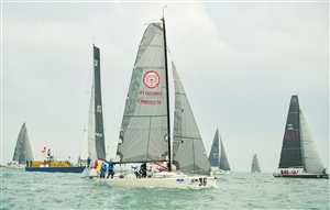 海帆賽參賽船只在海口灣揚帆起航。