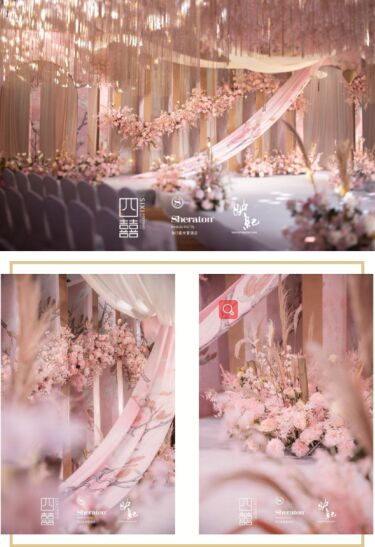 本次婚禮秀在海口喜來登酒店五洲宴會廳舉行。婚禮秀現(xiàn)場采用時下流行的“粉、金”色為主基調(diào),桃花粉的清新搭配富麗的金色,巧妙地營造出新中式婚禮的氛圍,為嘉賓帶來唯美精致的婚尚體驗。