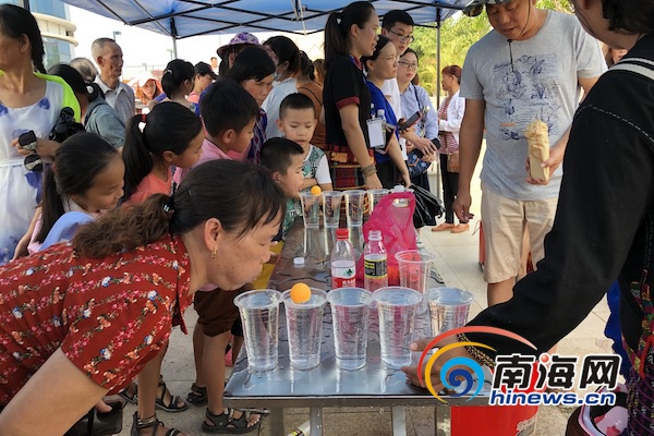 活動現場,整齊排列的蒙眼敲鑼、投籃球、彈球、投圈、飛鏢等十余個趣味活動展位前排起了長龍。市民游客玩的不亦樂乎。 南海網記者 劉子榕攝