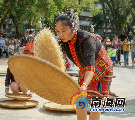 4月8日上午,五指山市在三月三廣場舉行舂米比賽,一位參賽選手正在篩米。南海網記者 葉子青 攝