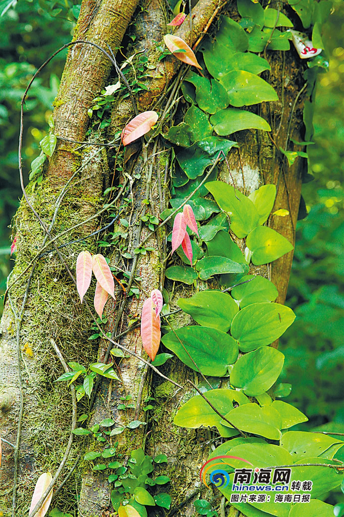 “其實,這些黃金索叫海南藤芋,是附生在大樹上的海南藤芋懸垂下來的根,但能長成這么多、這么長、這么粗,也得有幾十年了。”黃青良介紹,海南藤芋在海南中部各林區較為常見,但長得這么壯觀的卻是很少見。略顯遺憾的是,這棵古樹枝葉太高,種類繁多的附生植物又將其枝干遮掩得嚴嚴實實的,這也讓黃青良一時難以辨別其具體種類,但他認為應是青藤公或是其近似種。