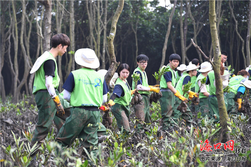 中韓志愿者在東寨港國家級自然保護區內栽種紅樹苗木。石中華 攝
