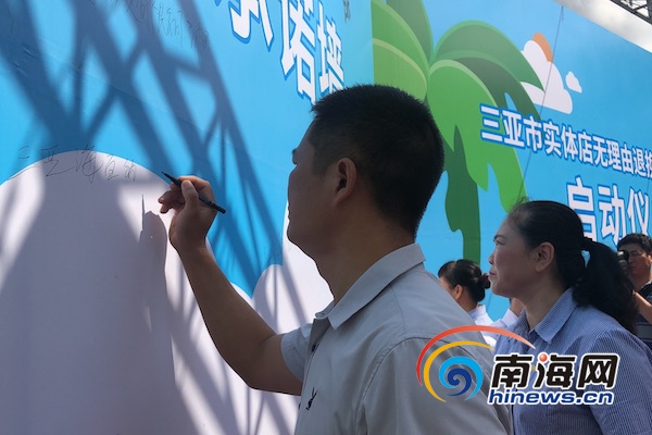 啟動(dòng)儀式現(xiàn)場,夏日百貨、三亞國際購物中心、勝利廣場、旺豪超市、三亞國際免稅城、南山文化旅游區(qū)、亞龍灣熱帶天堂森林公園和22家旅游購物店的相關(guān)負(fù)責(zé)人在承諾墻上簽字,表示自愿作為首批開展7日無理由退貨承諾試點(diǎn)企業(yè)。