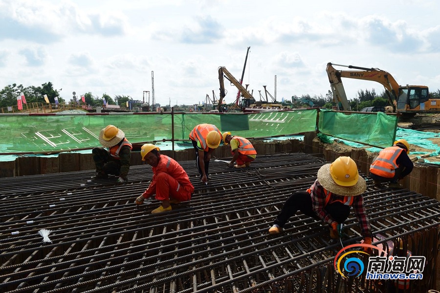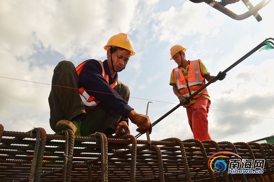 海口江東新區白駒大道改造及東延長線項目建設現場,工人正在鋼筋上作業。海報集團全媒體中心記者 張茂 通訊員 王聘釗 攝
