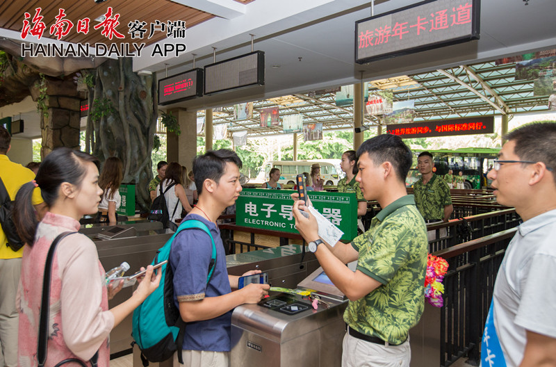 5月1日,在海南呀諾達(dá)雨林文化旅游區(qū)游客中心,持有海南旅游年卡的游客刷臉進(jìn)入景區(qū)。海南日?qǐng)?bào)記者 武威 攝