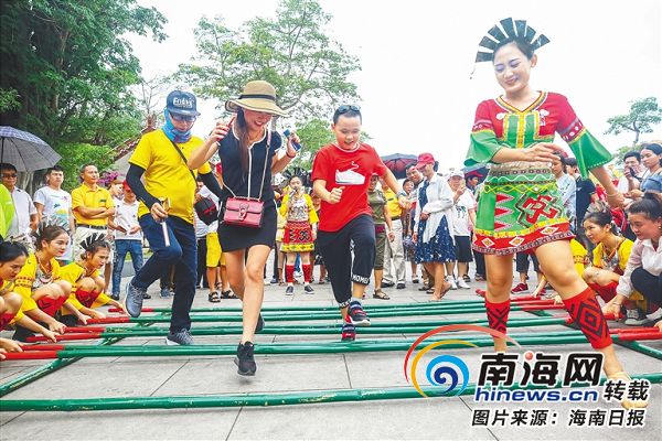 5月2日,游客在三亞南山文化旅游區(qū)跳竹竿舞。當(dāng)天,三亞南山景區(qū)接待中外游客2萬(wàn)余人次。
