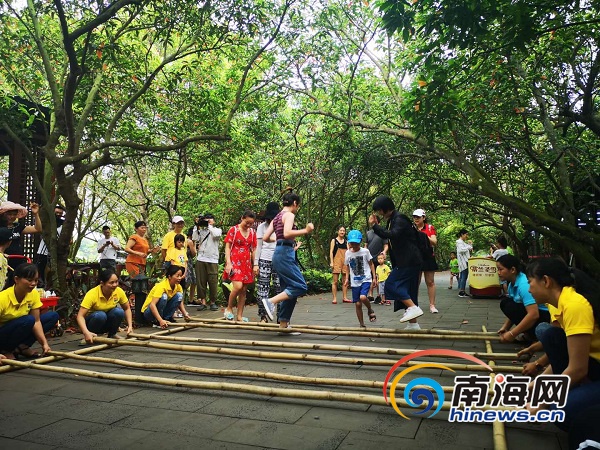 馮塘綠園內(nèi)游客體驗竹竿舞。南海網(wǎng)記者 蘇靚 攝