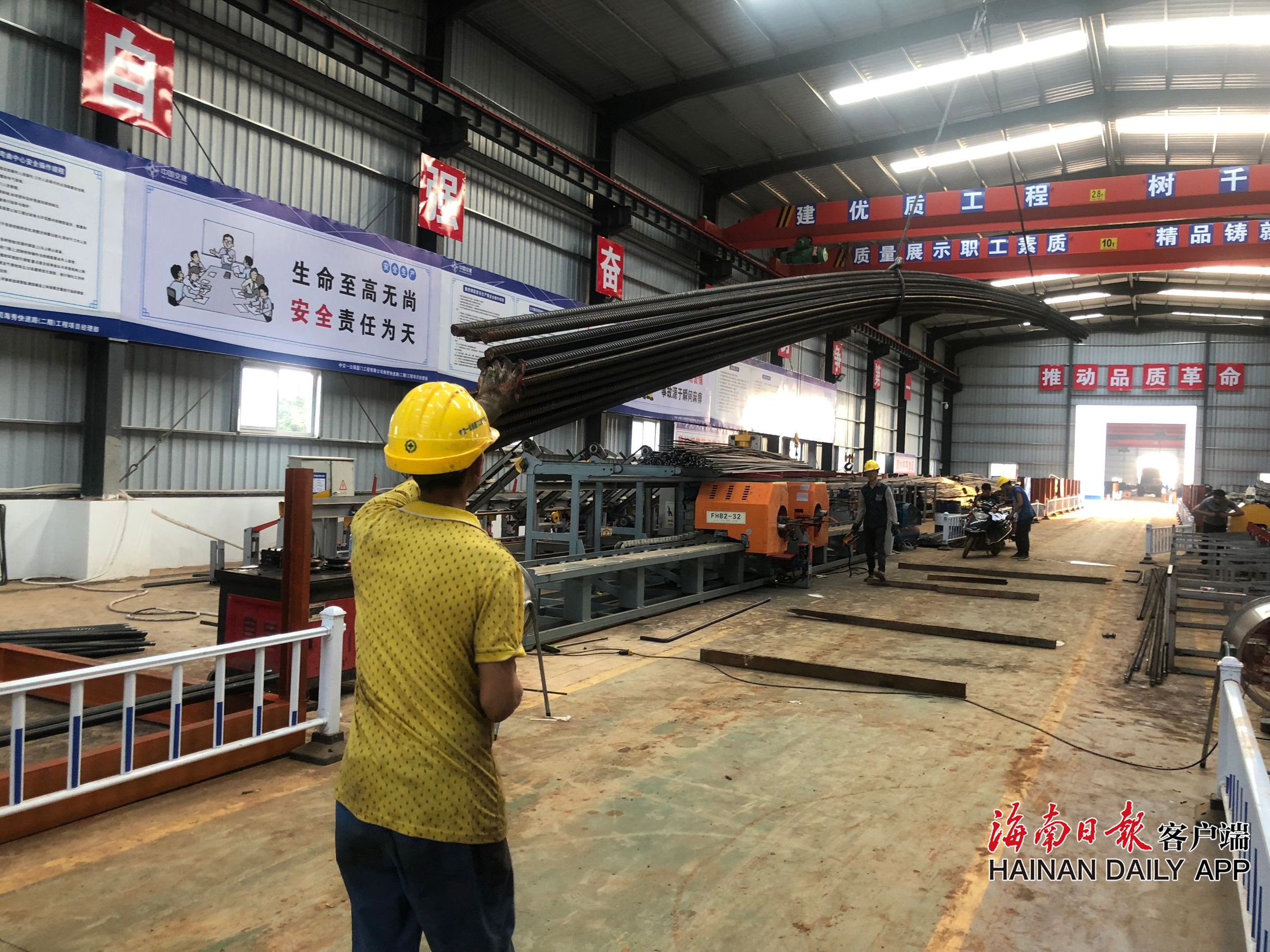 此時雖已是下班時間,然而工地現場依然是一幅熱鬧景象。記者看到,鋼筋加工廠棚內,工人正操作著機械完成鋼筋切割、彎曲等加工工序,加工好的鋼筋被運送至各個橋梁墩身旁,由汽車吊吊至頂部交由工人綁扎,4、5個工人一天可以綁扎完一個墩身。