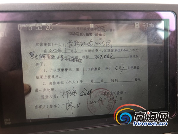 海口市工商局給長影環球100下發整改通知書。南海網記者 蘇靚 攝