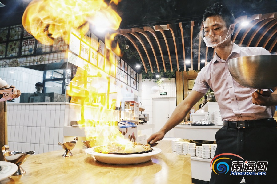 師傅點上火,火焰躥上40厘米高,一道美味的火焰牛排隨之制成。南海網記者 姚皓 攝