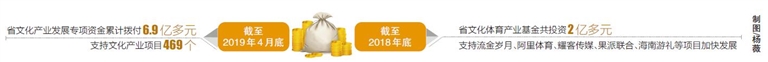 有政策支持,更有“真金白銀”的資助。截至2019年4月底,省文化產業發展專項資金累計撥付6.9億多元,支持文化產業項目469個。截至2018年底,省文化體育產業基金共投資2億多元,支持流金歲月、阿里體育、耀客傳媒、果派聯合、海南游禮等項目加快發展。