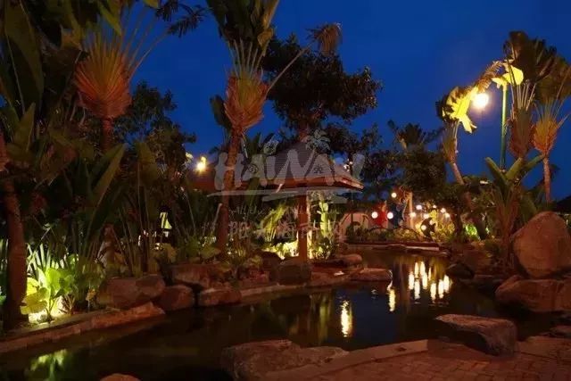 溫泉占地81畝,椰林婀娜、田園環抱,是全國首家魚療養生溫泉。溫泉擁有可同時容納2000人的超大休閑區,49個功效各異的泡池,有“人魚共浴”等多項大型特色項目。