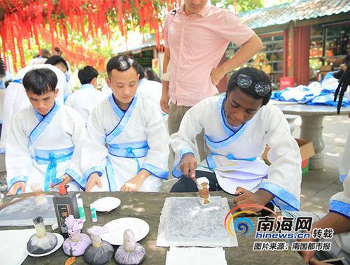 “講解老師說要沿著字體的邊緣敲,受力要均勻,這樣才能拓印出一副好看的字畫。”在掛滿紅條寄語祝福的大榕樹下,來自老撾的留學生梅康一邊拓印東坡書法,一邊和同伴交流經驗。
