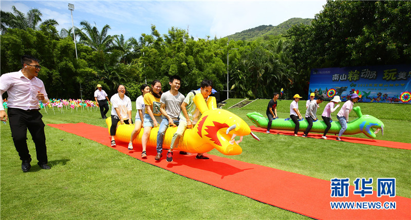 資料圖:端午假期,游客在三亞南山景區(qū)體驗旱地賽龍舟趣味活動。新華網(wǎng)發(fā)
