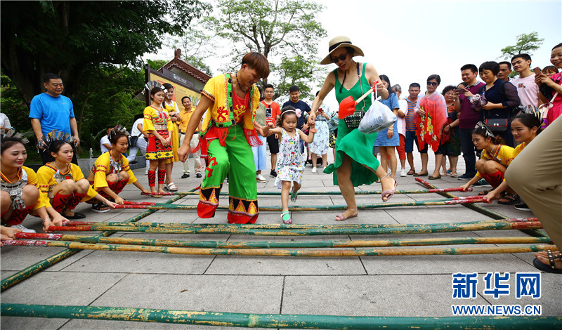 資料圖:端午假期,家長帶孩子在南山景區(qū)和演員跳竹竿舞。新華網(wǎng)發(fā)
