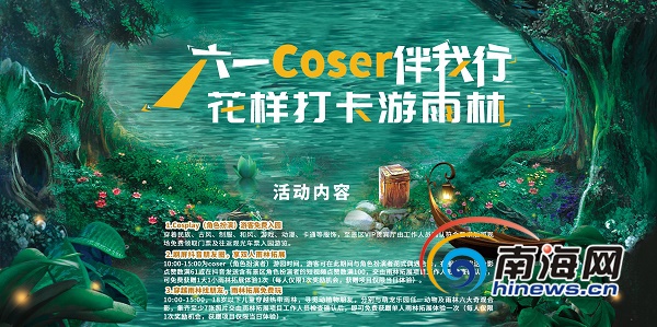海南旅游頭條、南海網、南海網客戶端海口5月28日消息(南海網記者孫令正 通訊員葉玉琪)小童大夢想,大童小時憶。今年“六一”國際兒童節,為打造獨特雨林節慶、營造歡樂游園氛圍,呀諾達雨林文化旅游區將推出以“花樣打卡游雨林 六一coser伴我行”為主題的cosplay(角色扮演)游園活動,邀請大小朋友參加。