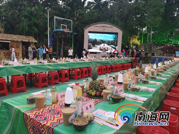 在抱班村的廣場上,一字排開的黎家長桌宴非?!拔Α保教m酒、利國涼粉、熱帶水果、果汁飲料擺放整齊,地道的美味讓四方賓客在“舌尖”認識樂東、了解樂東。