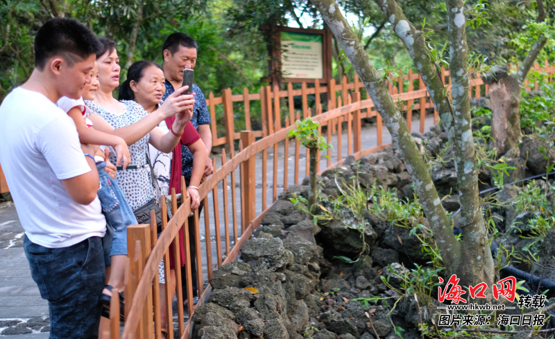游客在海南省首批旅游小鎮——秀英石山鎮施茶村火山石斛園游玩。