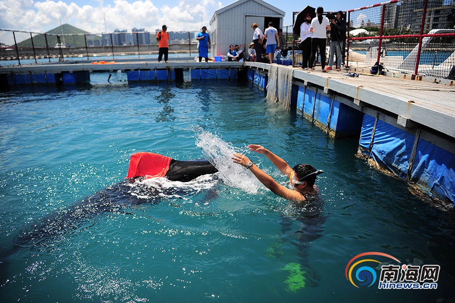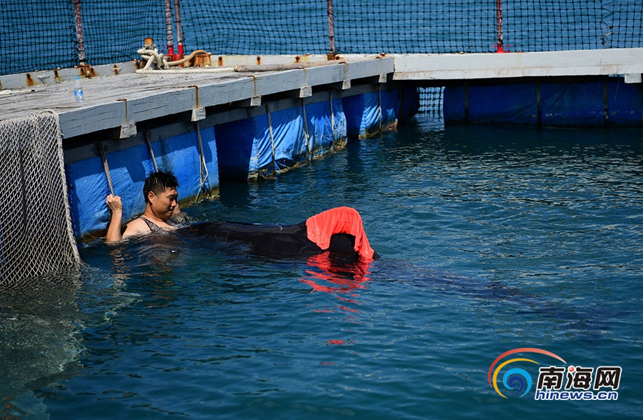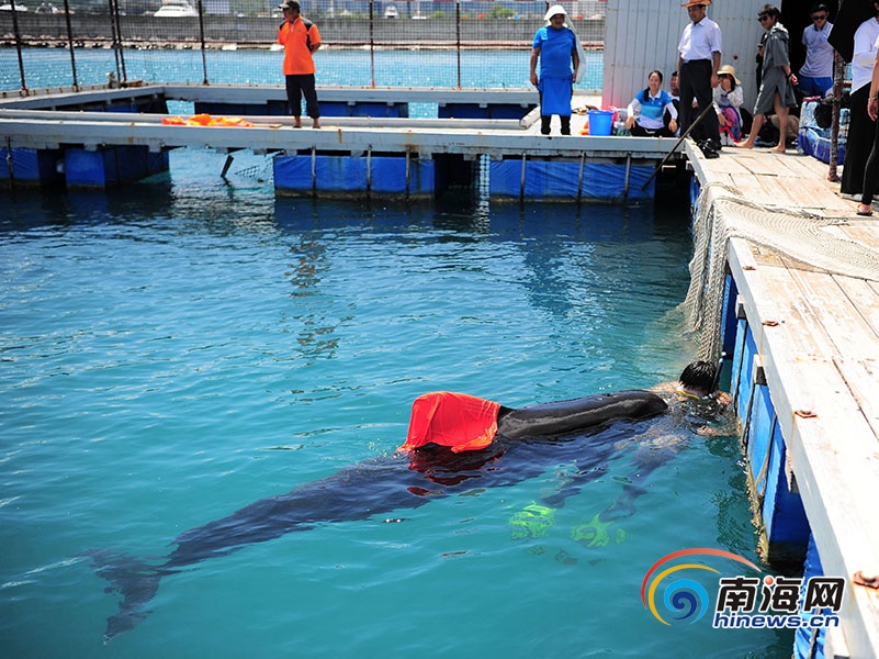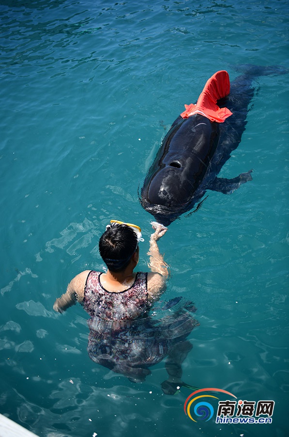 6月8日,三亞,潛水員給領(lǐng)航鯨喂食。南海網(wǎng)記者 沙曉峰攝