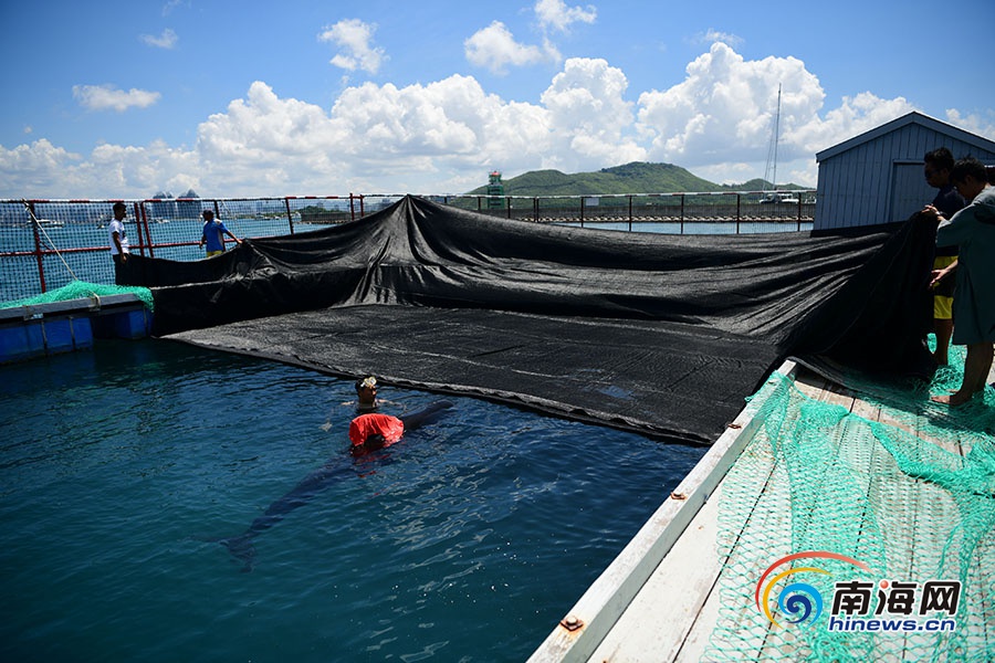 由于天氣炎熱,11時(shí)20分左右,救援隊(duì)在浮箱上方搭起防曬網(wǎng),避免陽(yáng)光直射導(dǎo)致領(lǐng)航鯨脫水。