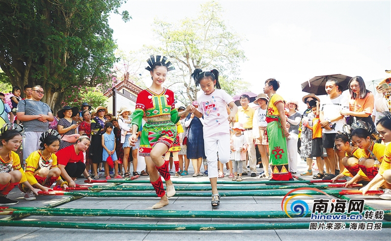 6月8日,三亞南山景區,孩子們跳起竹竿舞。海南日報記者 武威 特約記者 陳文武 攝