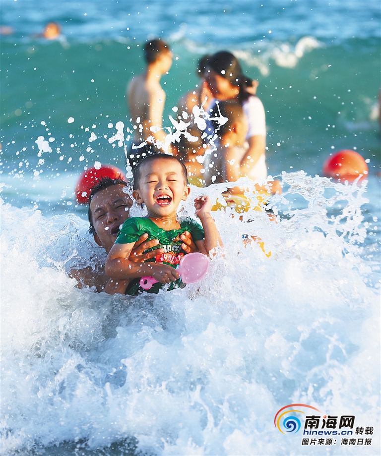 6月7日,三亞大東海,父母帶著孩子水中嬉戲。 海南日報記者 武威 特約記者 陳文武 攝