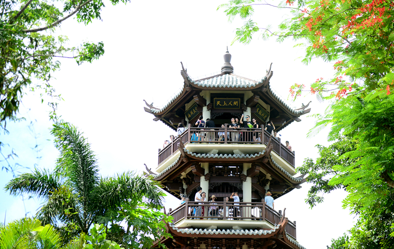 隨著仲夏時節到來,天氣較為炎熱,熱帶雨林中的涼爽環境受到中外游客的青睞。端午節當天,不少市民游客在蘭花谷納涼賞花。而景區中的過江龍索橋、大佛石全海景玻璃棧橋、滄海樓、婚禮廣場等景點,不僅海風習習,更可觀碧海藍天的美景,吸引眾多游客紛紛拍照留念。