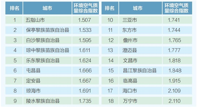 按照城市環境空氣質量綜合指數(以二氧化硫、二氧化氮、可吸入顆粒物、細顆粒物、臭氧、一氧化碳6項指標進行計算)評價,2019年5月,空氣質量排名靠前的分別是五指山市、保亭黎族苗族自治縣和白沙黎族自治縣,排名靠后的分別是萬寧市、海口市和臨高縣。2019年5月全省18個市縣(不含三沙市)城市(鎮)環境空氣質量排名見下圖。