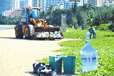 6月20日早晨,園林工人正在將游客夜晚丟棄在三亞灣沙灘上的垃圾清掃收集,并用鏟車運走。