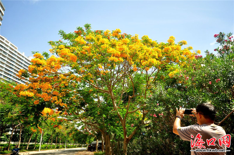 近日,在海南三亞半山半島帆船港附近,一棵黃色鳳凰花開,花兒布滿樹梢,異常醒目,引來市民游客拍照。 圖為市民拍照。冠海 攝(來源:海口網)