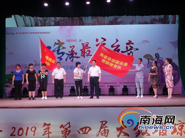 現場,海口市委常委、宣傳部部長王忠云,海口市人大常委會副主任、美蘭區委書記馮琳還為陳素珍瓊劇名角志愿服務隊和大致坡瓊劇戲迷志愿服務隊進行授旗。
