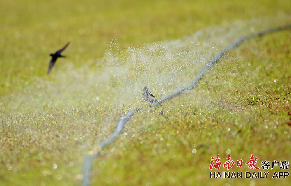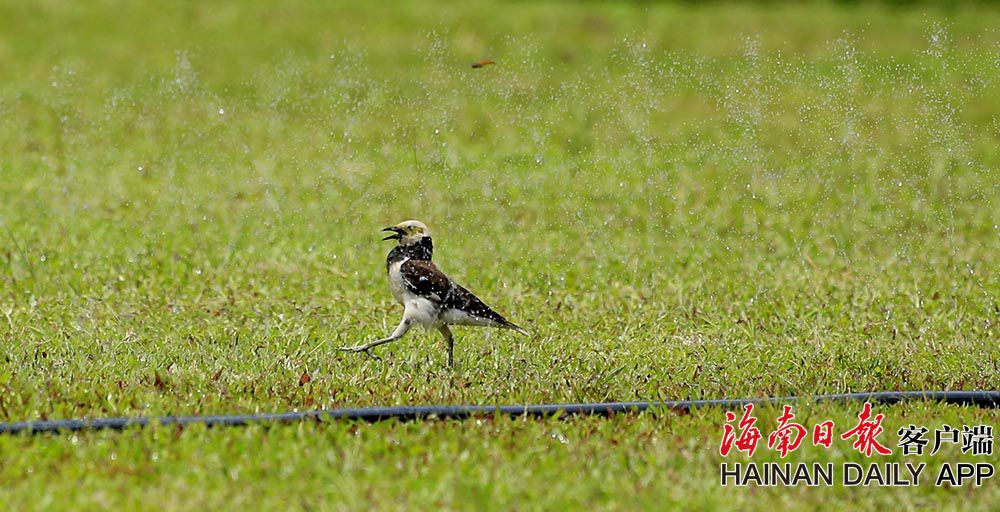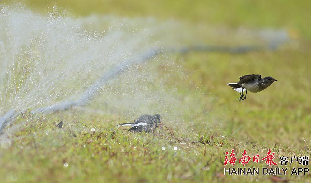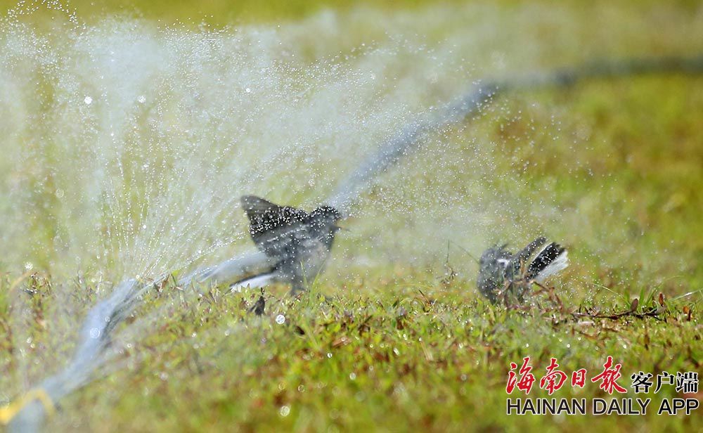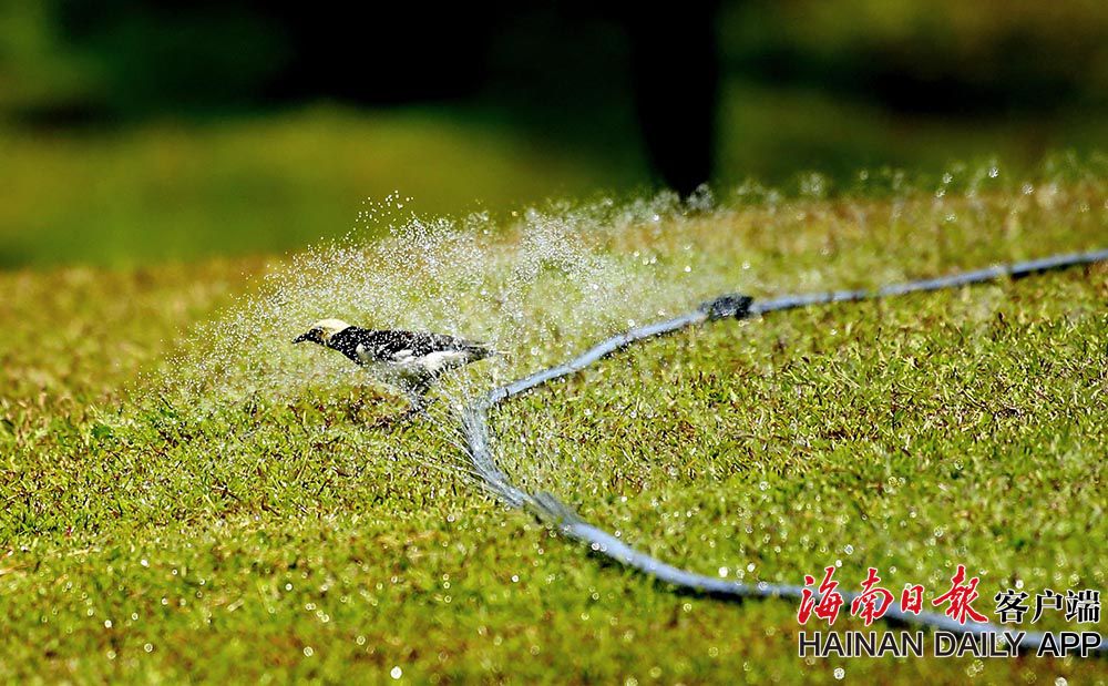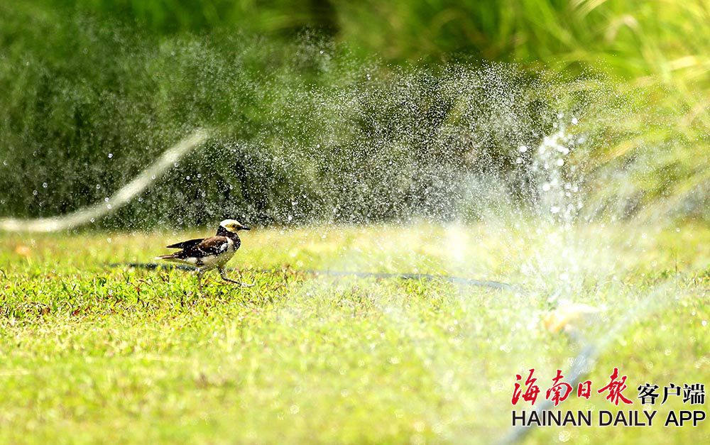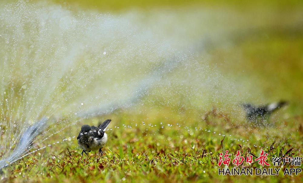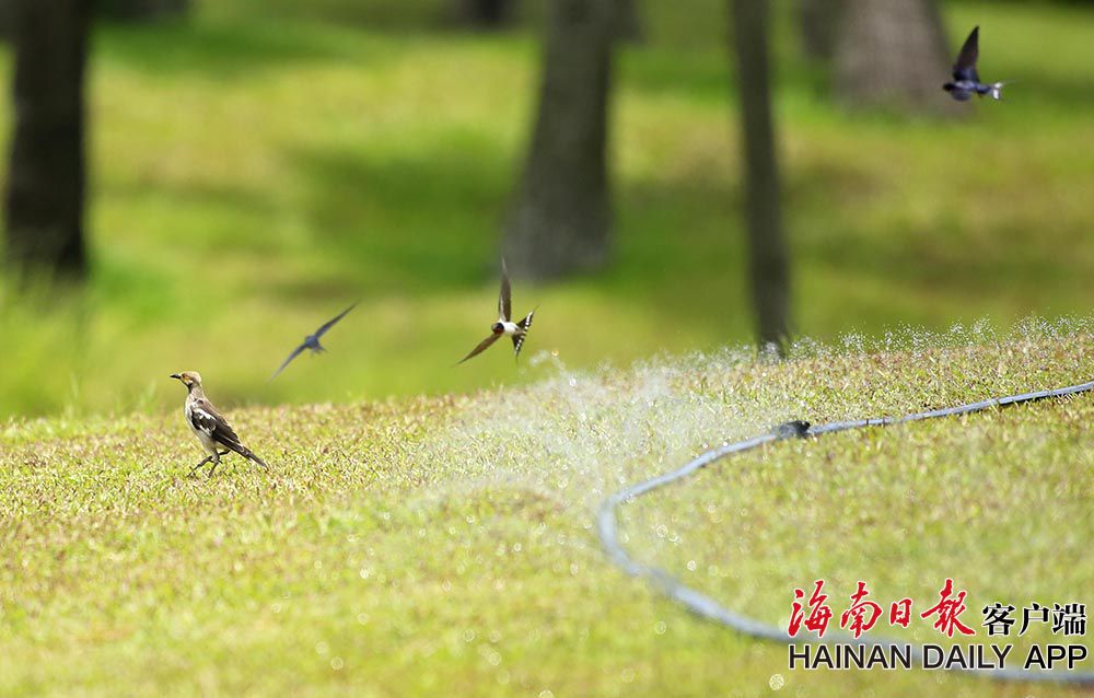 6月23日,在海口美舍河鳳翔濕地公園,一群群小鳥在噴管前“沐浴”降暑。連日來海南持續出現高溫天氣,小動物也想盡辦法為自己降溫降暑。 (據海南日報客戶端|記者 陳元才 攝影報道)