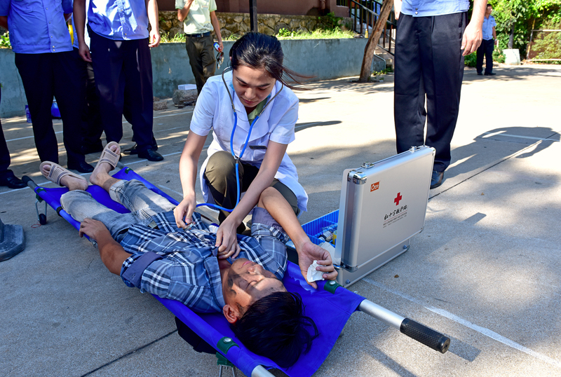 “火災”發生后不到幾分鐘,景區安保部五位專業消防員,身穿消防服、頭戴消防帽、全副武裝的乘坐水罐消防車及時趕到“火災”現場進行“滅火”。在現場看到,兩位員工在周邊拉起了警戒線,防止無關人員進入火場;景區醫務人員在現場展開救援工作,為“受傷”的客人及員工進行“包扎”等。在“火災”現場看到,景區員工們有條不紊地進行消防滅火、疏散員工、火場警戒和現場救援等應急處置工作。