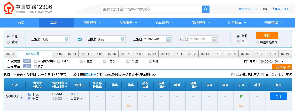 海口站至長流站票價為2元,用時10分鐘;
