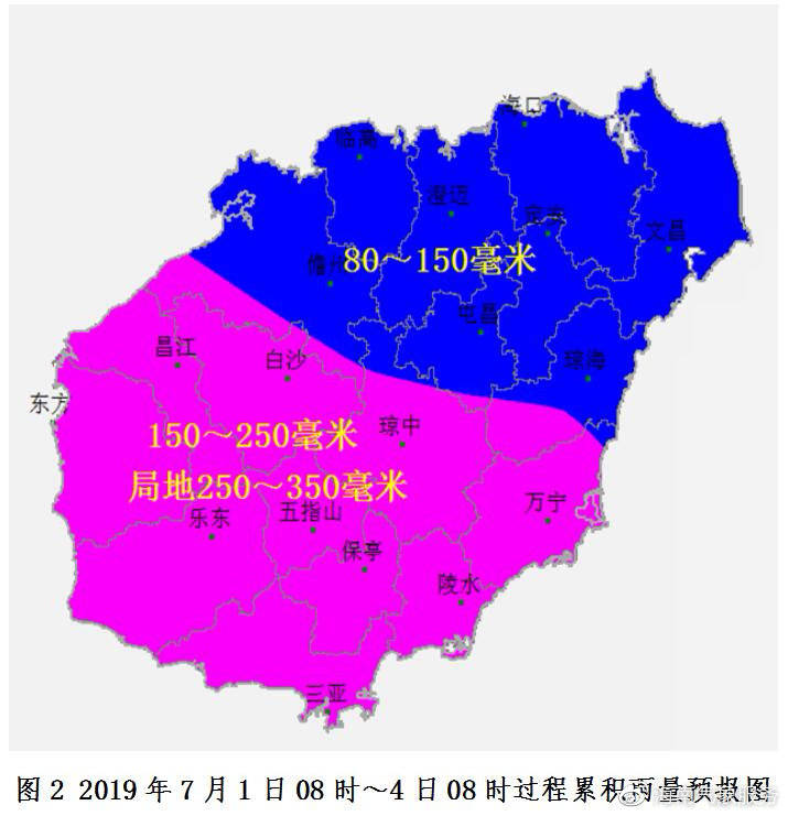預(yù)計7月1日08時~4日08時各地過程雨量:萬寧、瓊中、昌江、白沙、東方、五指山、保亭、陵水、樂東和三亞等市縣150~250毫米,局地250~350毫米(見圖2);海口、文昌、瓊海、定安、屯昌、澄邁、臨高和儋州等市縣80~150毫米。